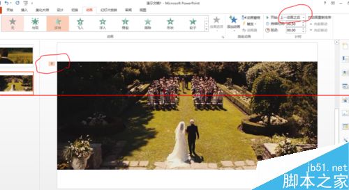 3、接著在動畫欄中的開始一欄中把“單機時”改為“上一動畫之后”,會看到圖片動畫標簽“1”會變成“0”。之后的幻燈片同樣做此操作,最后播放幻燈片即可看到效果。
