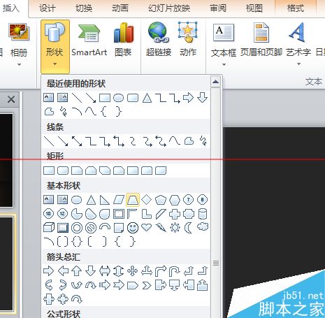 1、先畫一個(gè)等腰梯形,在菜單欄中選擇插入,在插入選項(xiàng)卡中選擇圖形,找到等腰梯形,在ppt中畫出