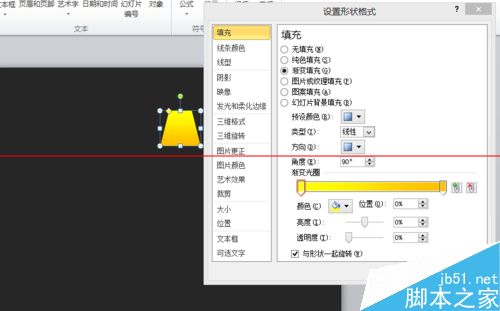 2、選中等腰梯形,右鍵點(diǎn)擊,選擇設(shè)置形狀格式,填充選中漸變填充,漸變光圈兩個(gè),左邊選擇顏色黃色,右邊選擇顏色金色