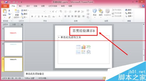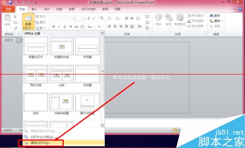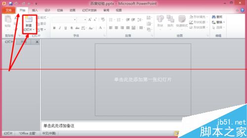 3、打開新建的“百度經(jīng)驗(yàn).pptx”,我們點(diǎn)擊“開始”,選擇“新建幻燈片”下的三角圖標(biāo)
