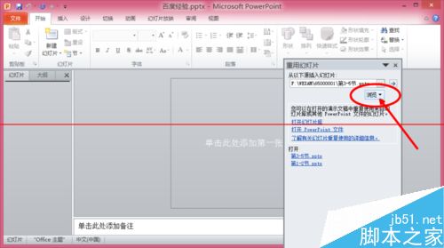 4、點(diǎn)擊“重用幻燈片”,點(diǎn)擊“游覽”,選擇“游覽文件”