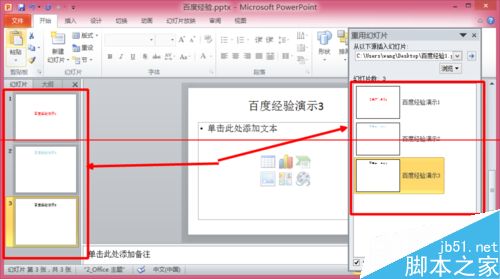 6、同樣的方法,點(diǎn)擊“重用幻燈片”,打開“百度經(jīng)驗(yàn)2”,選擇“保留原格式”,雙擊即可出現(xiàn)