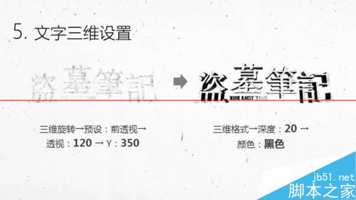 5、文字三維設置。文字三維旋轉預設設置為前透視→透視為120°→三維深度設置為20→深度顏色設置為黑色。