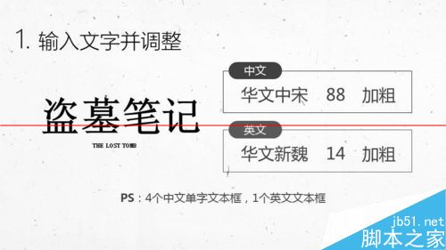 1、輸入文字并調整。輸入中英文:盜、墓、筆、記、THE LOST TOMB五個文本框。中文用華文中宋→字號88→加粗。英文用華文新魏→字號14→加粗。