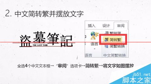 2、中文簡轉繁。全選中文文本框→審閱選項卡→簡轉繁→將文字如圖擺放。