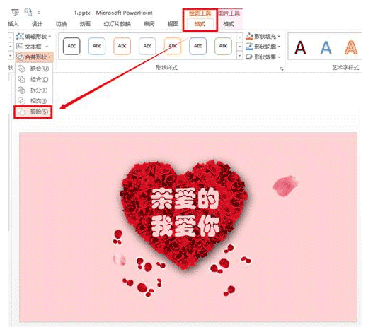 先選中形狀,按住Shift鍵,再點擊表白文本,在【格式】選項卡下找到【合并形狀】-【剪除】,然后你就會發現字體鏤空了(為了方便看出來,這里設置了粉色背景)