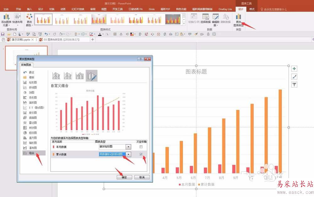 3、更改累計數據系列的圖表類型,點擊圖表工具下的"更改圖表類型,點擊“組合”,累計數據選擇帶數據標記的折線圖,并勾選次坐標軸。