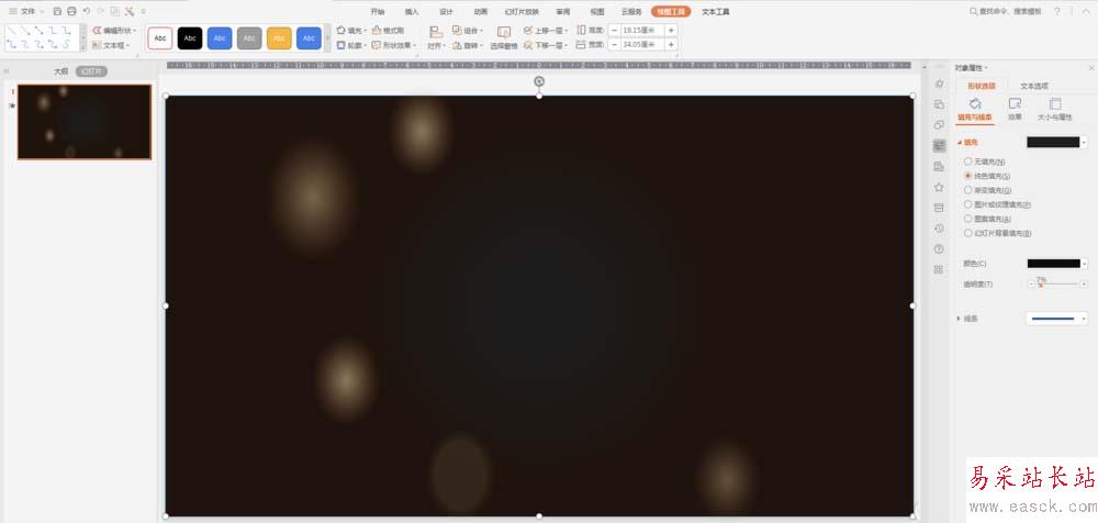 3、插入長(zhǎng)方形圖形,大小要超過(guò)幻燈片,設(shè)置一定的透明度,置于底層。