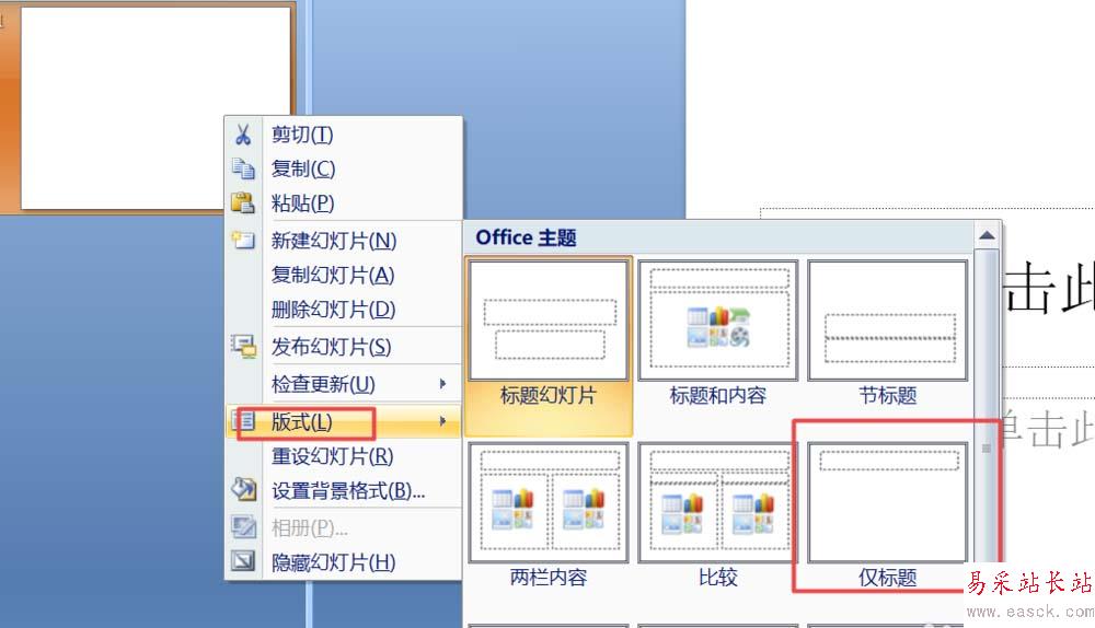 2、之后我們右擊選擇版式,然后點擊僅標題;