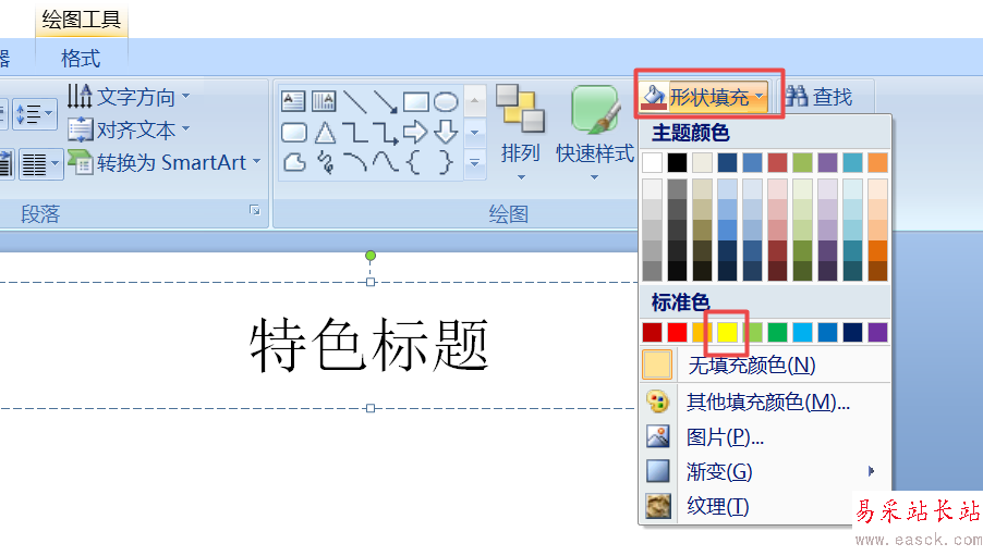 4、然后我們點擊形狀填充,彈出的界面,我們點擊黃色;