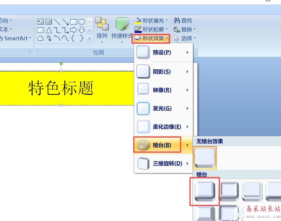 7、之后我們點擊形狀效果,彈出的界面,我們點擊棱臺,然后點擊選中第一個;