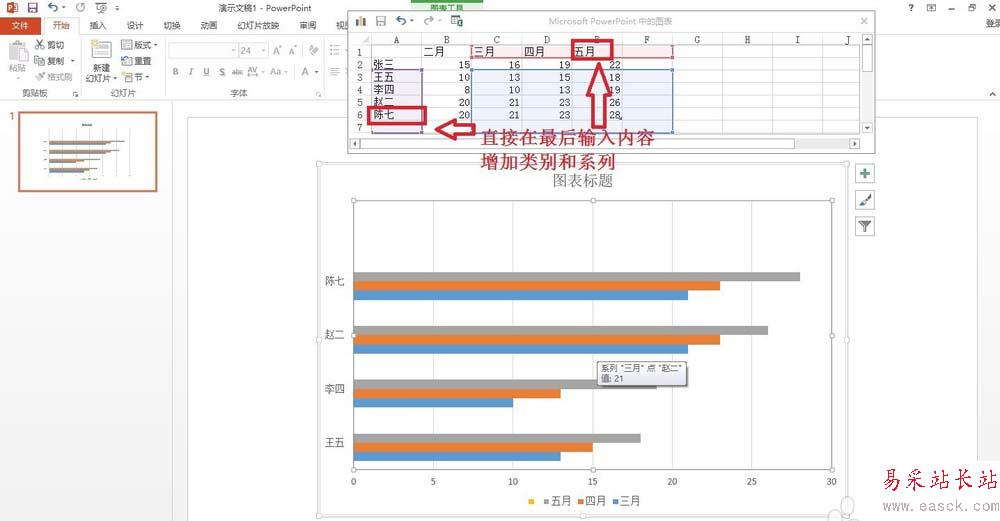 4、增加類別和系列,在PPT2013就是直接在后面添加類別和系列的內容就可以了。(舊版本要拖動內容框擴大范圍輸入數據才能在條形圖那里顯示)