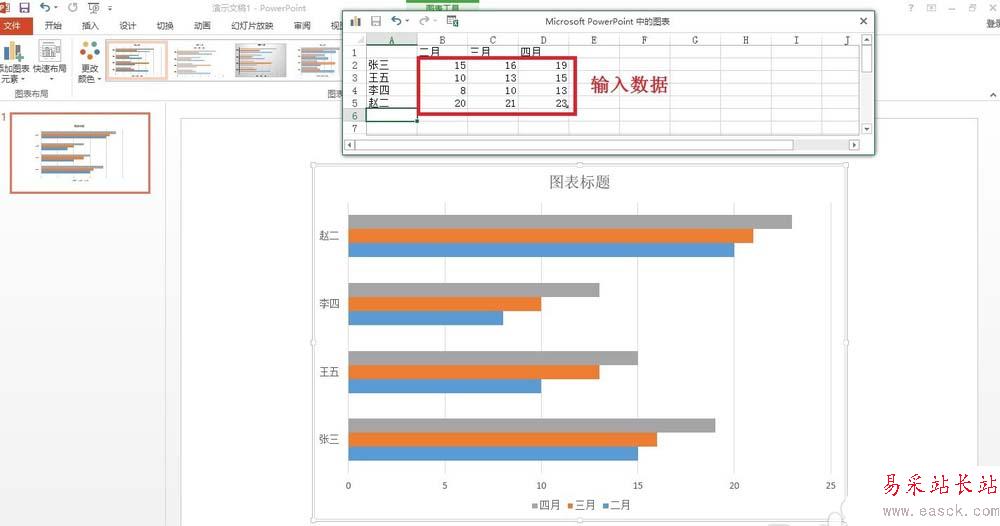 3、修改了類別和系列之后,在數據單元格那里修改數據,如輸入這幾個人在這幾個月的業績數據。輸入數據之后條形圖就會改變。