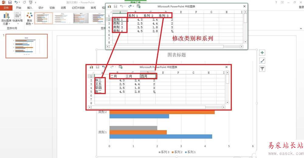 2、在彈出的條形圖中,既有圖形,也有一張EXCEL表格(舊版本的PPT要雙擊才能打開EXCEL表格)——在EXCEL表格那里把類別系列修改成自己要展示的內容(如類別修改成某個人的姓名,系列是