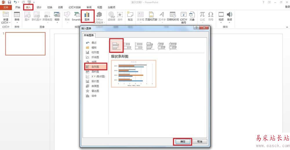 1、首先打開PPT2013——點擊插入——圖表——選擇條形圖——選擇條形圖樣式,有簇狀、堆積、百分比等條形圖(相應的還有三維的條形圖)——點擊確定,就可以打開條形圖了。