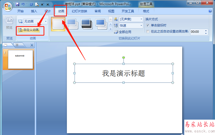 4、點擊文本然后在上方工具欄上點擊“動畫”->“自定義動畫”