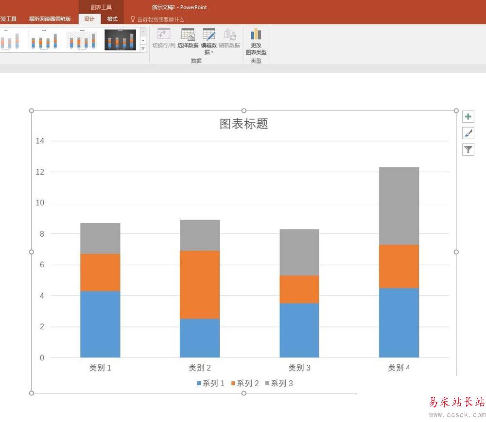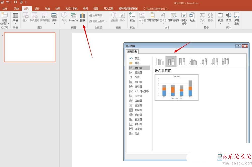 1、建立PPT文檔,點擊“插入”—“圖表”—“柱形圖”—“堆積柱形圖”。