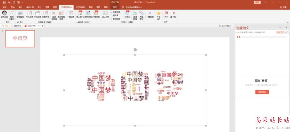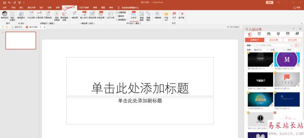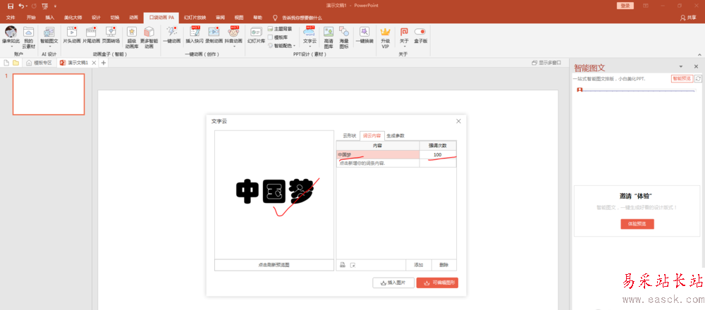 3、安裝完畢后,打開PPT,可以發(fā)現(xiàn)窗口顯示“口袋動畫”選項卡,選項卡中包括“文字云”命令。