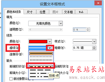 4、其次,設置線條的類型,系統默認的是實線。點擊虛線右側的小箭頭,我選擇了“劃線點”的類型。