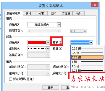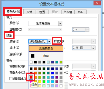 3、先設置線條的顏色。系統默認文本框線條是無色的。點擊顏色右側的小箭頭,在顏色選項卡中,我選擇了紅色。當然也可以選擇別的顏色。