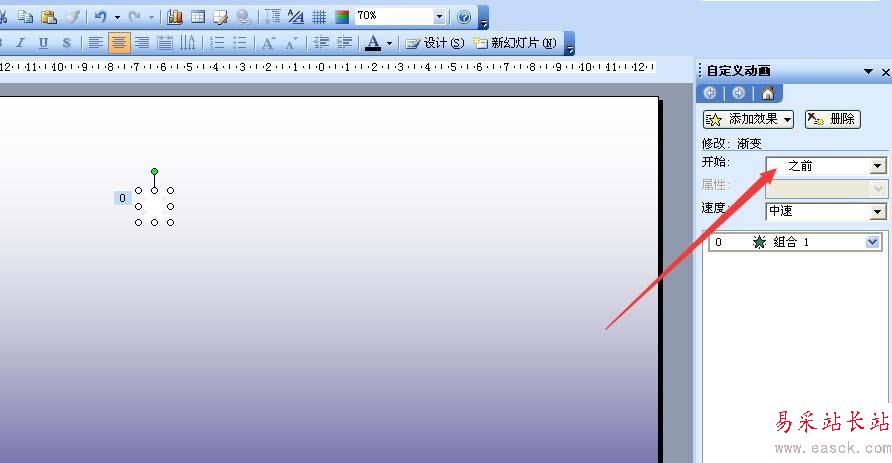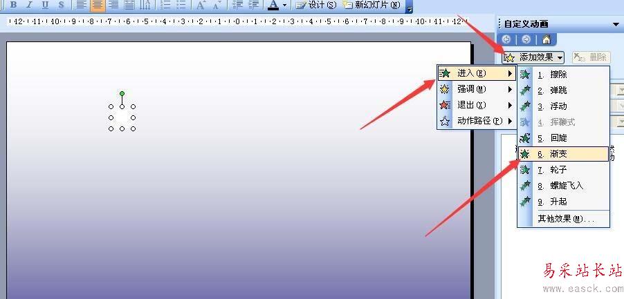 3、右擊雪花,點擊自定義動畫,點擊添加效果——進入——漸變,再開始改為“之前”如圖。