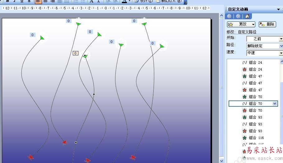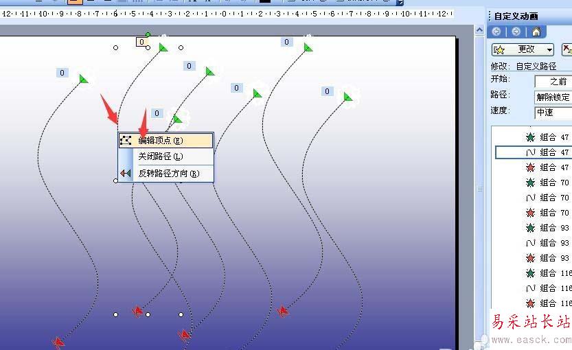 7、把一些的動作路徑修改下,不要個個都相同,右擊路徑,點編輯頂點,如圖,全部都修改好。