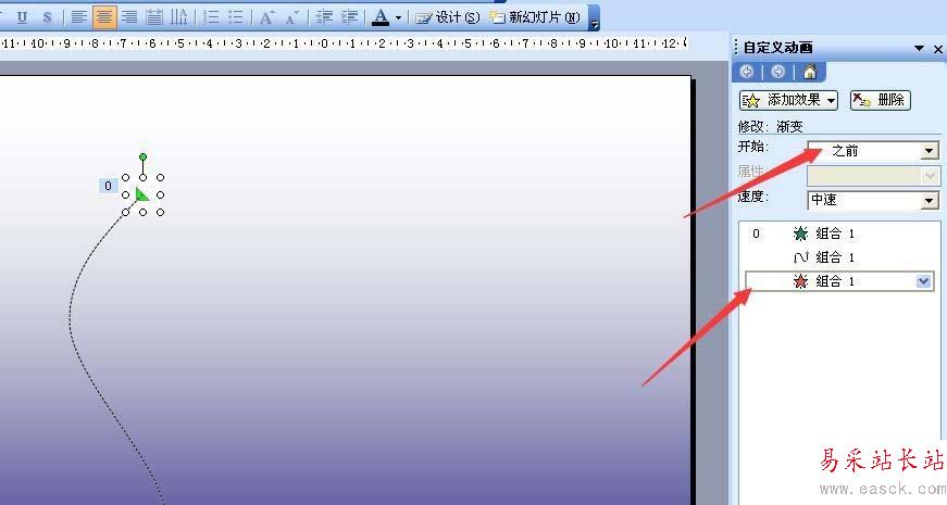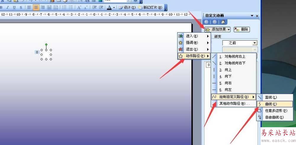 4、再添加效果——動作路徑——繪制自定義路徑——曲線,從雪花處點擊畫出一條動作曲線,如圖。在右側設置開始于之前,如圖。