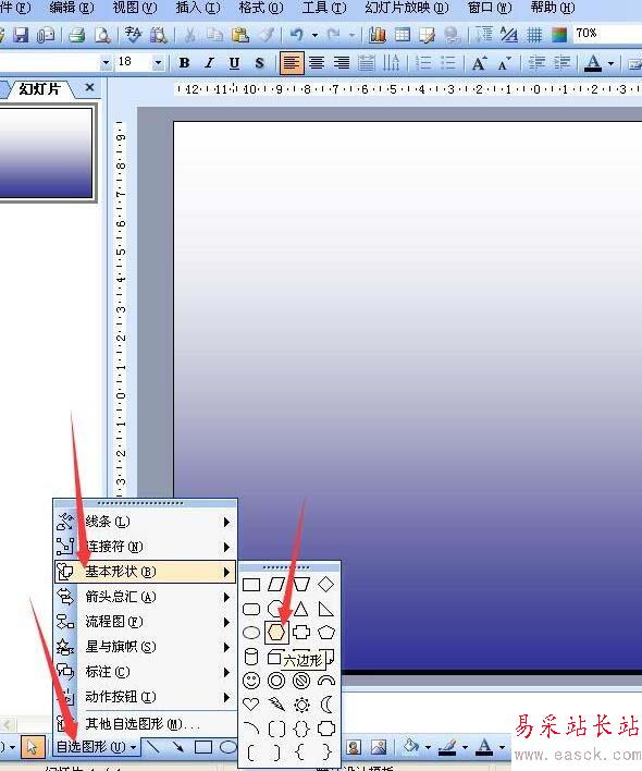 2、畫一片雪花,點擊自選圖形——基本形狀——六邊形,畫一六邊形,再畫一短橫線,再畫兩短斜線,組合成個大于號的形狀,復制多一個,水平翻轉。復制多幾個,如圖最后組合成雪花。