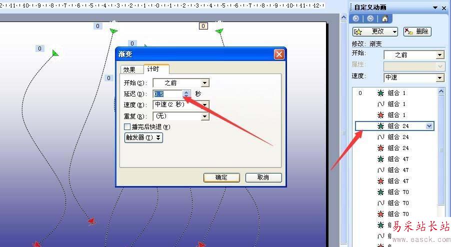 8、從第二個開始,設置各片雪花的進入延遲,有些延遲0.5秒,有些0.8,有些1,有些1.5等等,這樣雪花就會不規則的飄落。