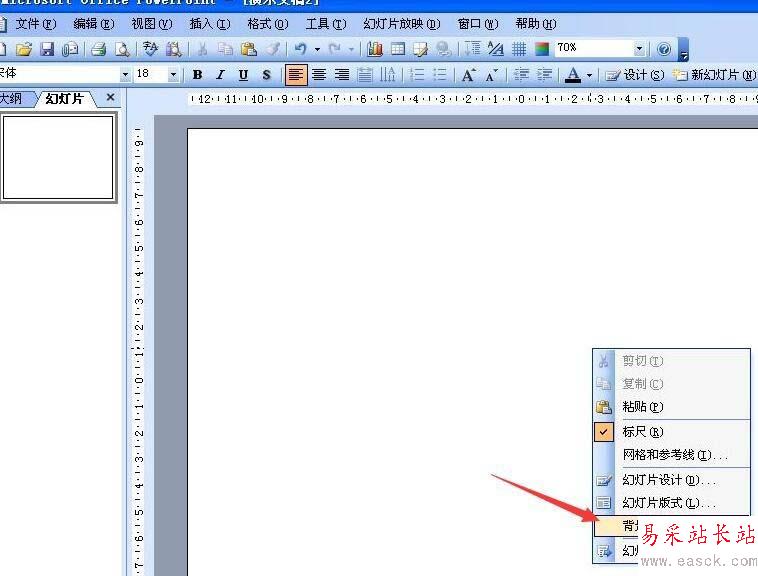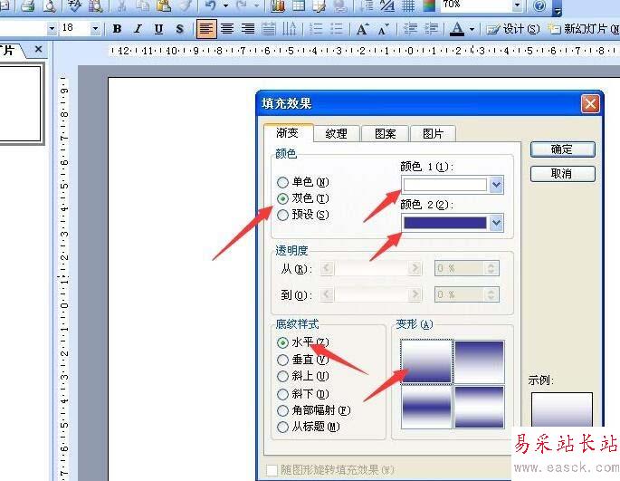 1、新建一個幻燈片,右擊,在彈出的菜單中選背景,設置雙色如圖。