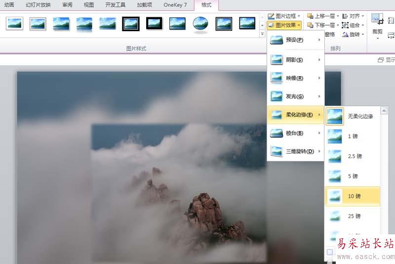 6、選擇前面的圖片,執行圖片效果-柔化邊緣-10磅命令,查看效果。