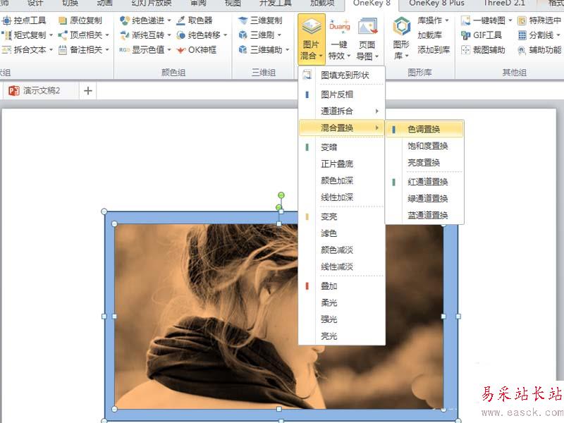 5、執行ctrl+a組合鍵全選,執行onekey-圖片混合-混合置換-色調置換命令。