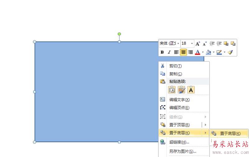 4、修改矩形填充顏色為淺藍色,右鍵單擊該矩形,從下拉菜單中選擇置于底層選項。