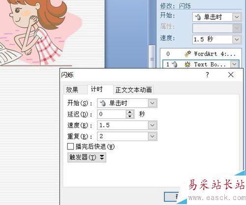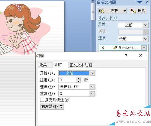 3、選中該效果,右鍵——計時,將效果出現選為之前、速度選快速,重復2次。完成標題的制作。
