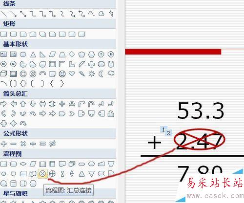 5、隨后,給它蓋上一個叉。插入——形狀——流程圖——匯總連接,在2.47上拉出該形狀,去除填充色,線條色紅色。