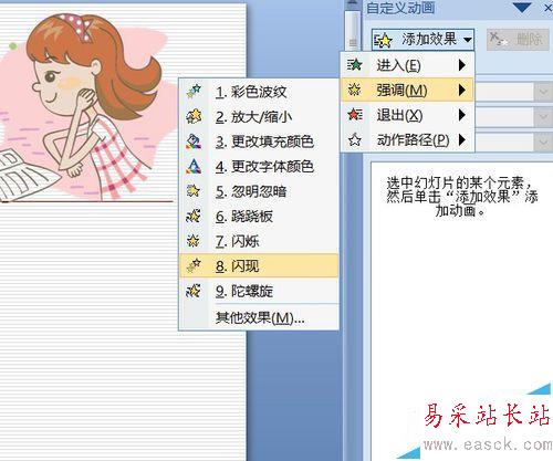 2、藝術字選中狀態,動畫——自定義動畫,打開自定義動畫面板,選擇添加效果——強調——閃現。為藝術字添加閃現效果。