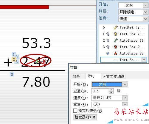7、叉消失的同時,錯誤的答案也會消失,2.47會移至正確的位置。答案7.80直接添加消失效果即可。2.47我們給它添加一個路徑,讓它向右移動。三個動作單擊后進行,我們讓答案7.80領頭,開始狀態選單擊時,并將該效果放至另兩個的上方,叉之后,2.47延遲0.5秒相隨。具體設置如圖。