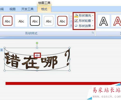 1、首先屏幕展示一個錯誤的式子,標題搖晃:錯在哪?標題是用藝術字寫出。我們在:插入——藝術字,選擇一種樣式即可。也可以在繪圖工具——格式中,對形狀填充、輪廓、效果進行更改。文本效果——轉換,可為藝術字添加彎曲形狀。拖動藝術字上的紅色菱形,可改變藝術字的弧度。