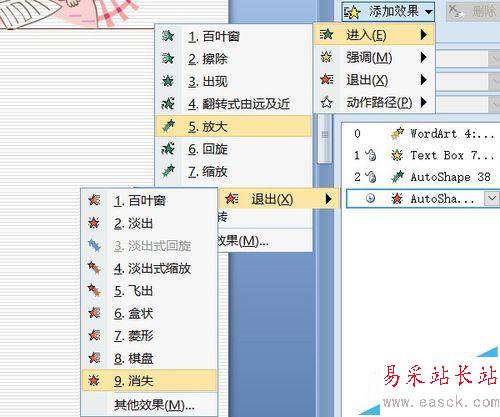 6、該形狀進入效果我們選單擊時放大。隨后還要消失,方便后面修改。所以,再添加一個消失效果。
