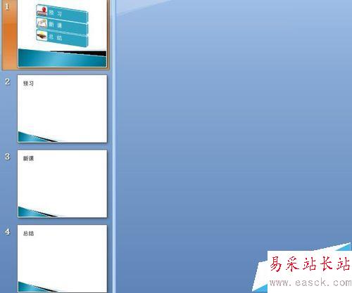 1、假設(shè)文檔中有很多幻燈片,每一個(gè)標(biāo)題會(huì)指向某一個(gè)固定的幻燈片,比如“預(yù)習(xí)”使用了三張幻燈片,則,“新課”在第四張開始,點(diǎn)擊該標(biāo)題會(huì)進(jìn)入該片。所以,我們要為每一個(gè)目錄設(shè)置一個(gè)鏈接。我新建了三個(gè)幻燈片,分別為幻燈片2、3、4,代表“預(yù)習(xí)”、“新課”、“總結(jié)”。