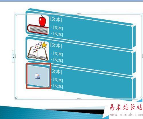 5、點(diǎn)擊圖片,會(huì)出現(xiàn)選擇圖片對(duì)話框,選定圖片后打開,圖片會(huì)以SmartArt設(shè)定的透視形狀出現(xiàn)在圖片區(qū)域,圖中上面兩個(gè)是添加后的圖片。