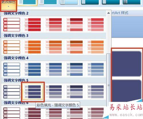 3、每一種點(diǎn)擊之后插入的圖形會(huì)出現(xiàn)預(yù)覽效果。圖中是更改顏色——強(qiáng)調(diào)文字顏色5,第二種的預(yù)覽。