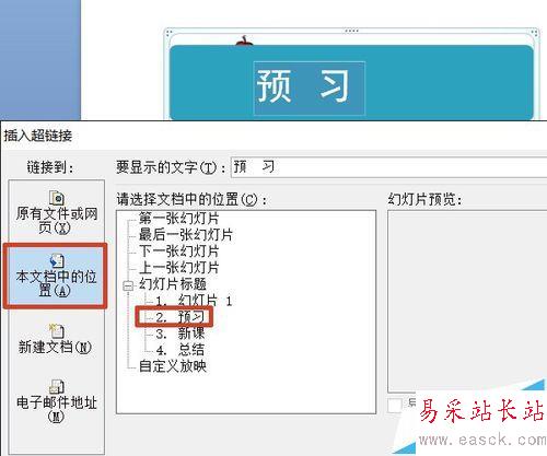 2、選中“預(yù)習(xí)”文字,插入——超鏈接——本文檔中的位置——幻燈片預(yù)習(xí),確定。
