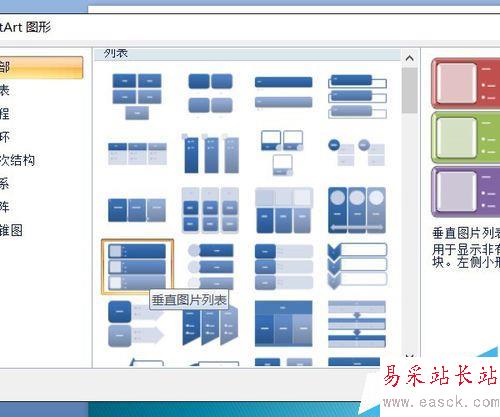 1、插入——SmartArt,隨后彈出的面板中有多種圖形供選擇,左側(cè)是圖形分類,中間是樣式選擇,右側(cè)則是所選樣式基本預(yù)覽(會(huì)因選擇的設(shè)計(jì)模板不同而改變),選擇一個(gè)滿意的圖形后確定。