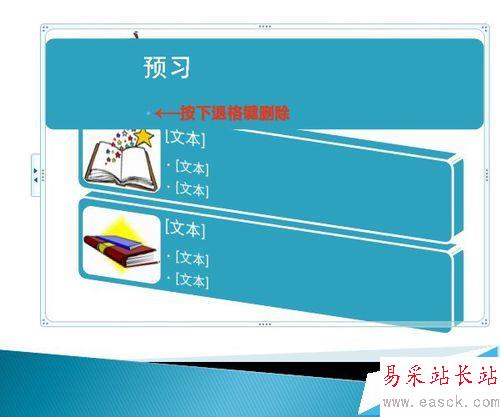 6、點(diǎn)擊文本,輸入該目錄標(biāo)題即可,如果有小標(biāo)題,可以在下方帶項(xiàng)目符號(hào)的文本出輸入,沒有,則按下退格鍵刪除該文本。