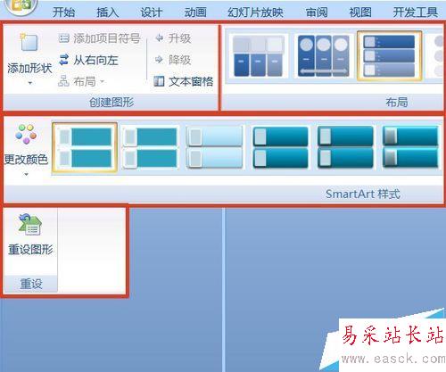 2、隨著選定的圖形出現(xiàn),工具欄中也出現(xiàn)相應(yīng)的工具:創(chuàng)建圖形、布局、樣式、重設(shè)四大部份。