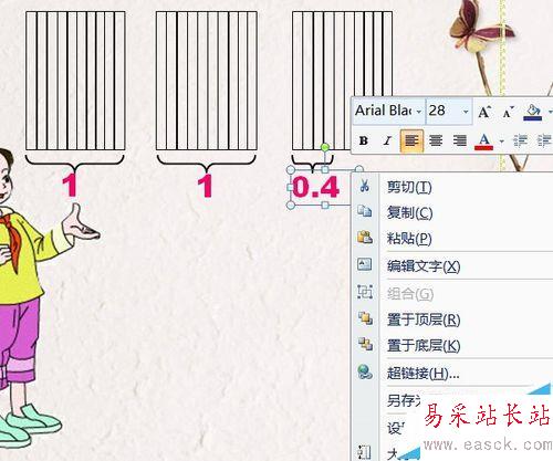 8、插入——文本框——橫排文本框,字體設置如圖,插入一個文本框,寫入“1”,放至第一個大括號下方。復制兩個放入后兩個大括號下方,將第三個的文字改為0.4。