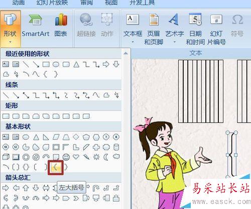 5、插入——形狀——基本形狀——左大括號,在舞臺上拉出一個大括號。