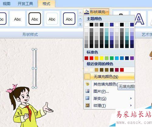 2、繪圖工具——格式——形狀填充——無填充顏色。使矩形只保留線條,為后面的過渡填充做準備。形狀輪廓配合背景,選比較清晰的色彩即可。