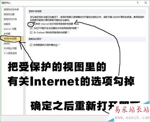 3、把受保護的視圖里的有關Internet的選項勾掉,點擊確定之后關閉目前文檔重新打開即可